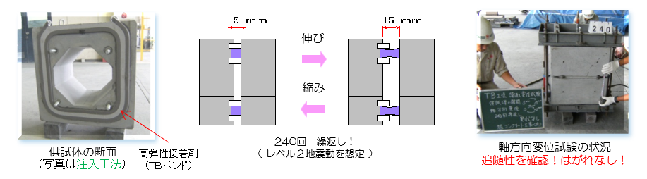 供試体2体を接着接合し,軸方向繰返し変位試験 によって地震動による変位に対する継手部の追随性を確認!